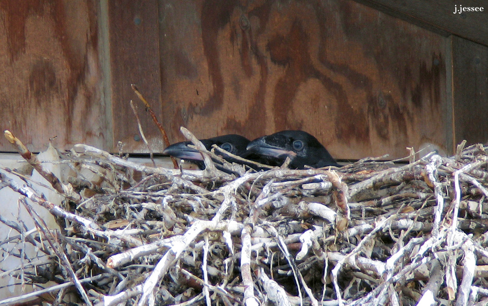 A raven built a nest in a set of moose antlers on the side of a building and 2 young ravens were in it!