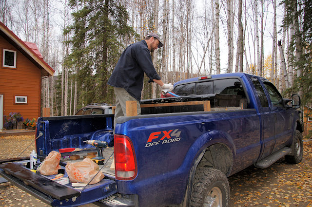 Jack says it was a hectic season. We are now on a month long road trip, heading down to the states. I plan on posting about our adventures when we get a chance. For now, I want to brag about the AWESOME custom bed cover Jack made to keep our belongings safe while we are traveling. It had to be custom because of his fuel tank (he hauls heating oil for our house) and toolbox that is already in the back. Here are a couple of photos of him building it and getting ready for our trip: