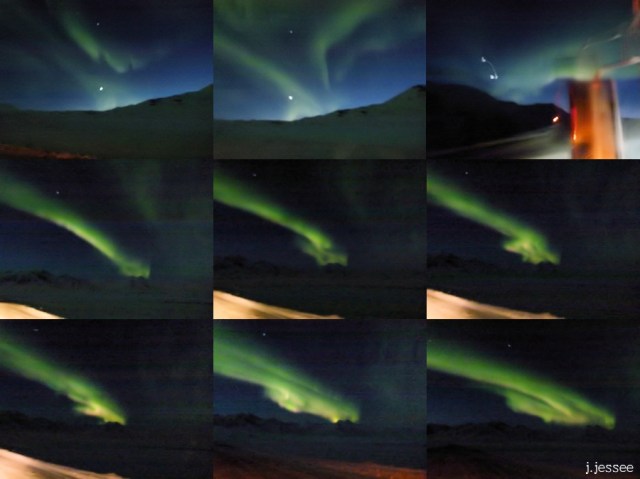 You can see the side mirror in one of them – he obviously took the top 3 from the truck. The bottom 6 shots show one formation getting larger from at first just a wisp in the sky. The northern lights are a winter-only phenomenon for us since in the summer it’s light throughout the night, from May until August. This awesome kind of sighting is a big perk for us in the winter, and boy do we deserve it after months of bitter cold and darkness.